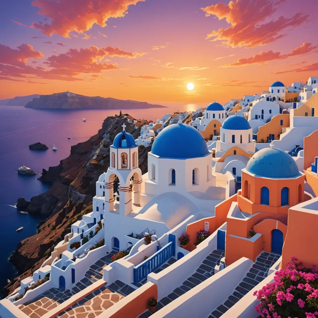 Санторини предлагает уникальное сочетание природной красоты и архитектурного колорита. Белые дома и церкви с синими куполами создают контраст с яркими цветами заходящего солнца, что делает каждый закат неповторимым.