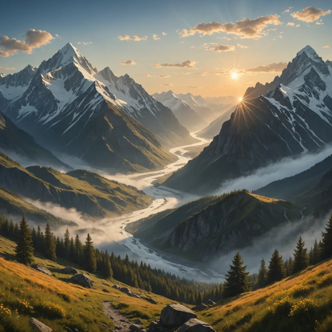 Горы Алтая — это место, где рассветы приобретают особую драматичность и величие. Высокие пики окутаны лёгкой дымкой, а первые лучи солнца окрашивают их в огненные оттенки.